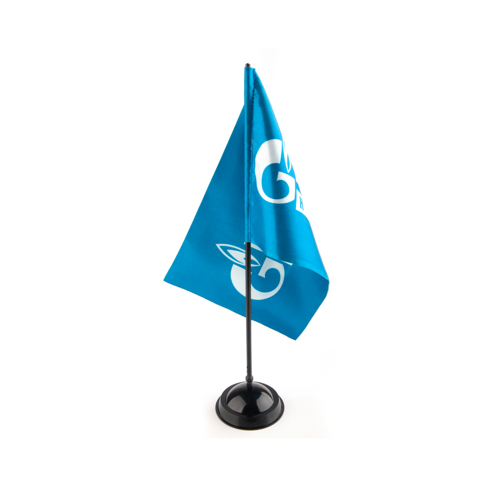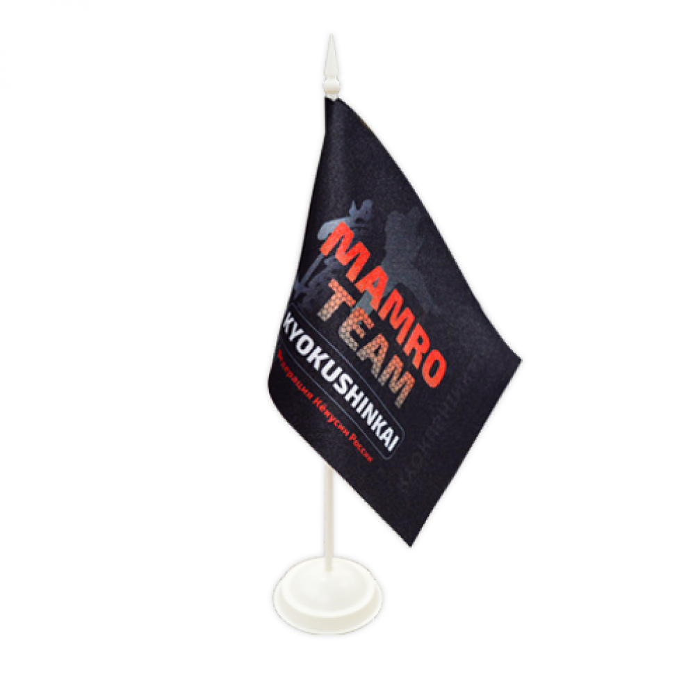 Флажок крепится на специальную настольную подставку с одним или несколькими штоками. Она может быть пластиковой или металлической по вашему выбору. Флагшток заказывается отдельно.