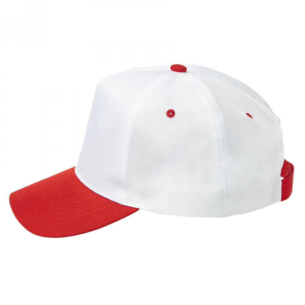 Параметры: Бейсболка "Joker", 5 клиньев, застежка на липучке; белый/красный; 100% п/э; плотность 140 г/м2