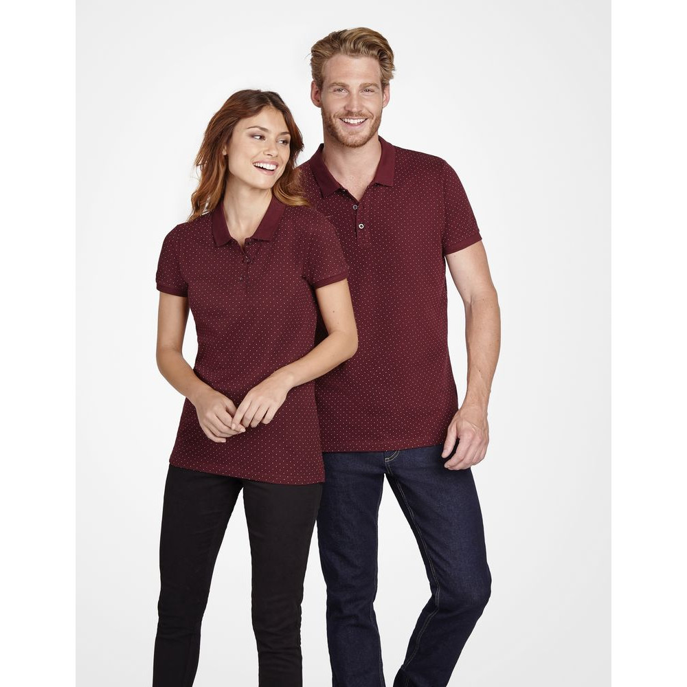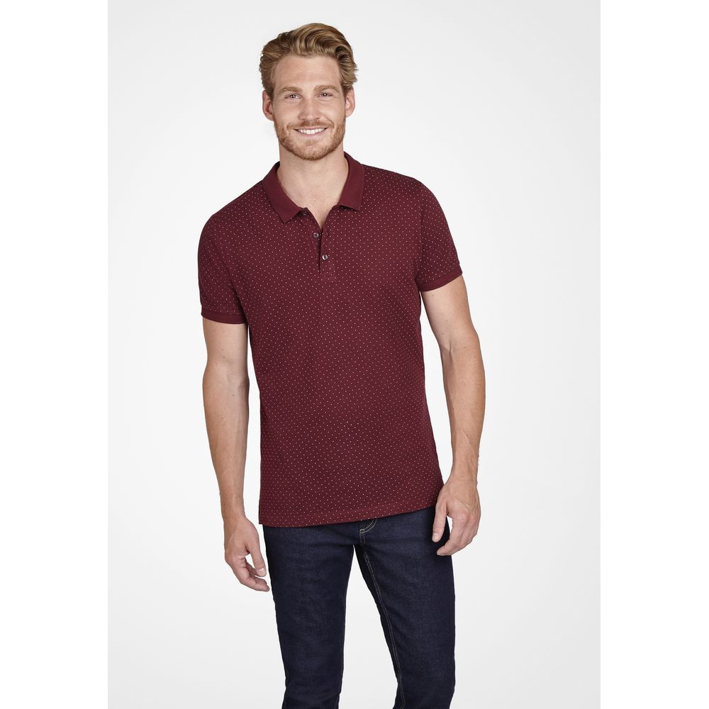 Рубашка поло приталенного силуэта с рисунком в точку. Лейбл производителя в боковом шве изнутри, в шве горловины - только бирка с размером, что позволяет вам нанести свой логотип.