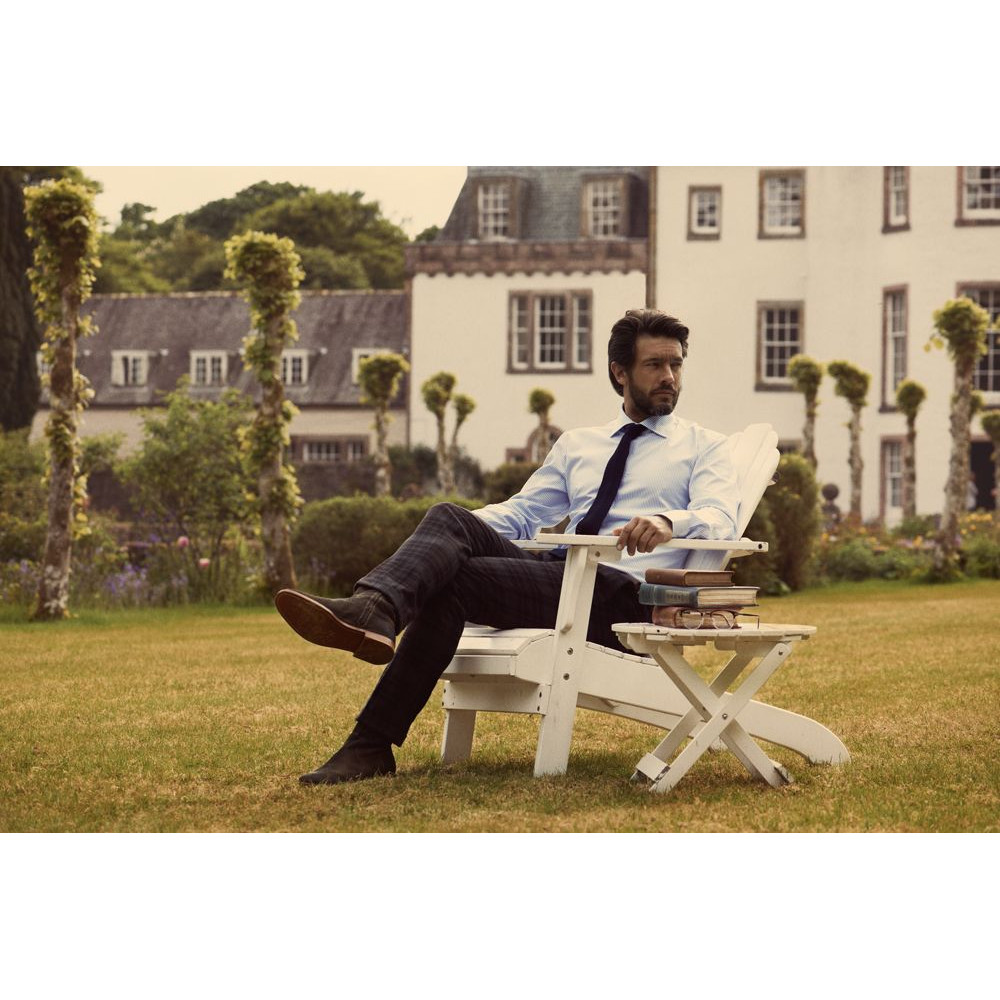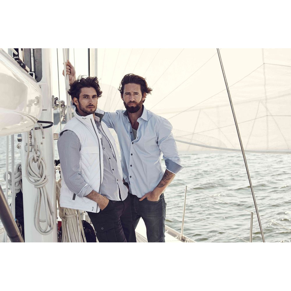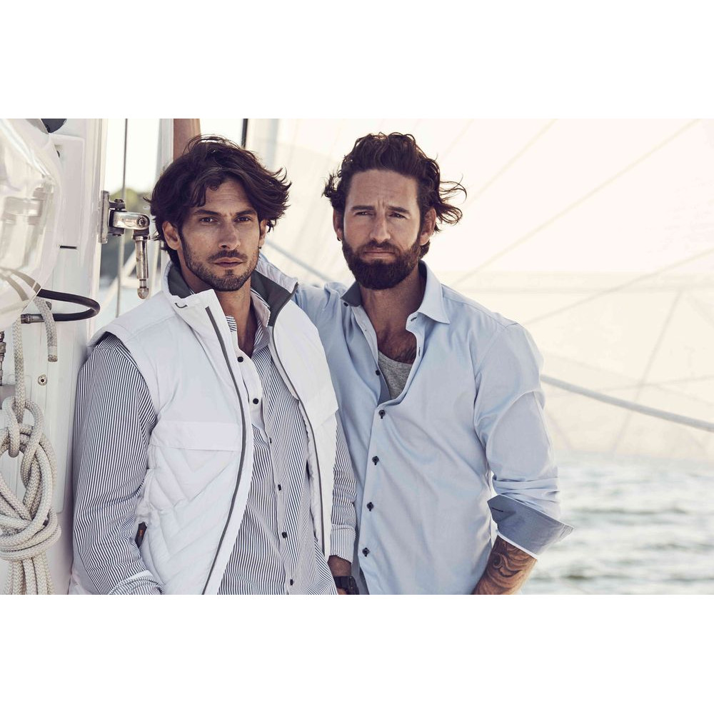 Мужская сорочка современного приталенного кроя из гребенного хлопка качества Easy Care (легко утюжить). Классический узор в полоску с контрастной отделкой оборотной части воротника, изнанки манжет и планки пуговиц. Упрочненные швы воротника и манжет.