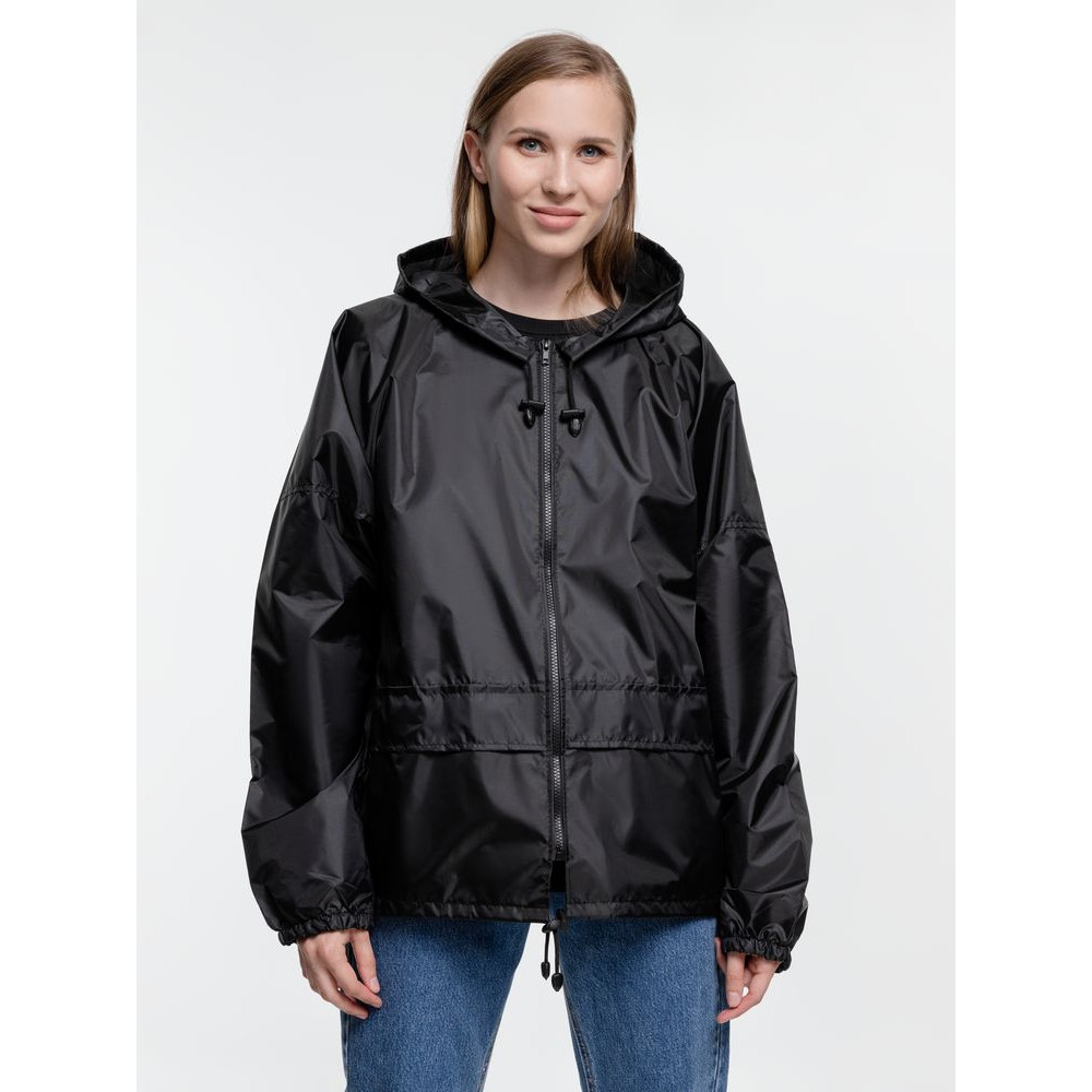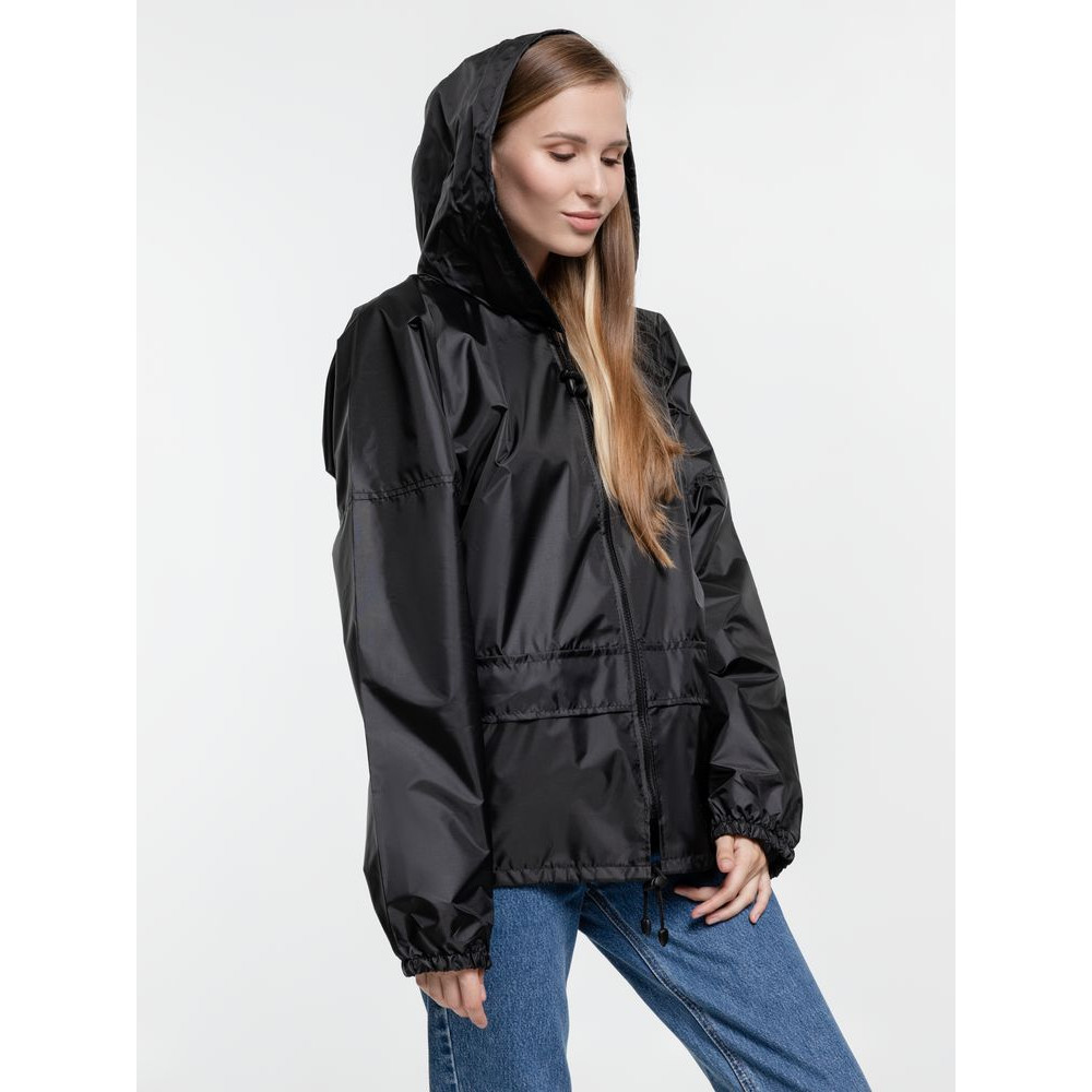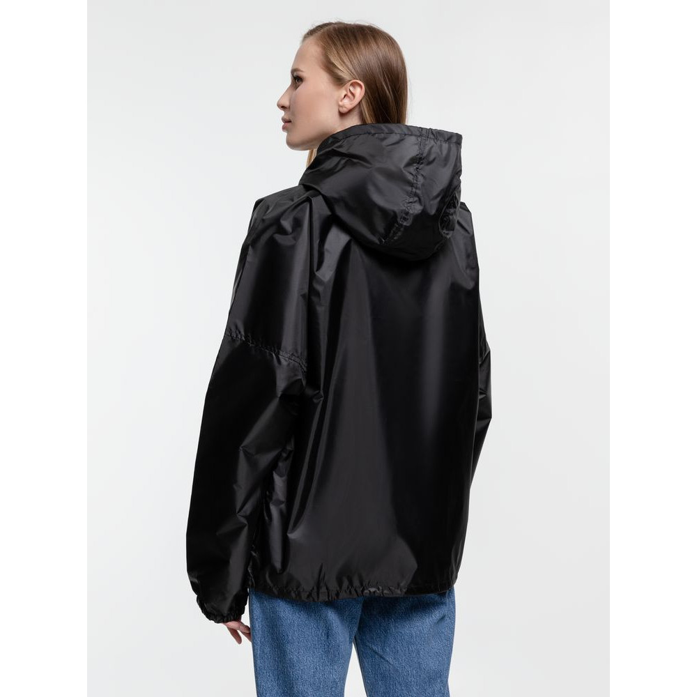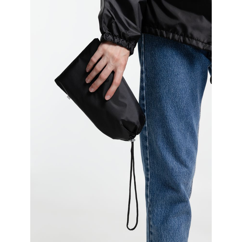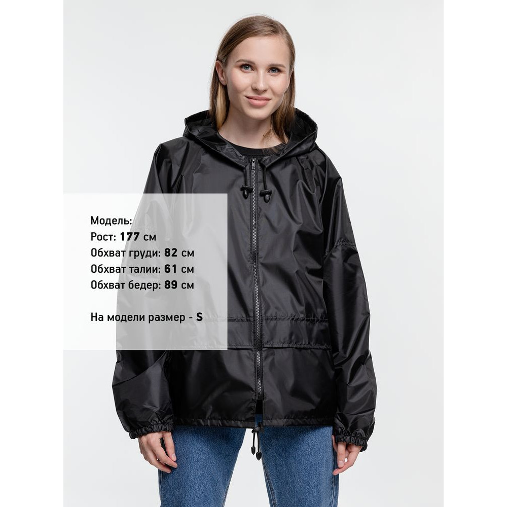 Укороченный дождевик свободного кроя из ткани таффета с влагозащитным покрытием. Складывается в мешочек — удобно брать с собой.