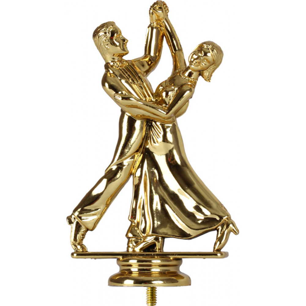 Фигурка пластиковая "Танцы". Цвет золото, высота 13 см. Изображены мужчина и женщина, танцующие в паре. Правая рука женщины и левая рука мужчины соединены и подняты вверх, другой рукой мужчина держит женщину за талию, женщина положила руку на плечо мужчине. Корпус женщины немного наклонен назад, одна нога так же выставлена назад и немного согнута в колене. Корпус мужчины так же немного наклонен назад, одна нога так же выставлена назад и немного согнута в колене. Мужчина одет в смокинг с бабочкой. Женщина одета в платье до колен с пышной юбкой, на ногах туфли на каблуках. Фигурка установлена на плоской прямоугольной подставке, под ней находится стем в виде небольшого элемента конусообразной формы. ¶Фигурку возможно закрепить на цоколь, постамент или кубок.