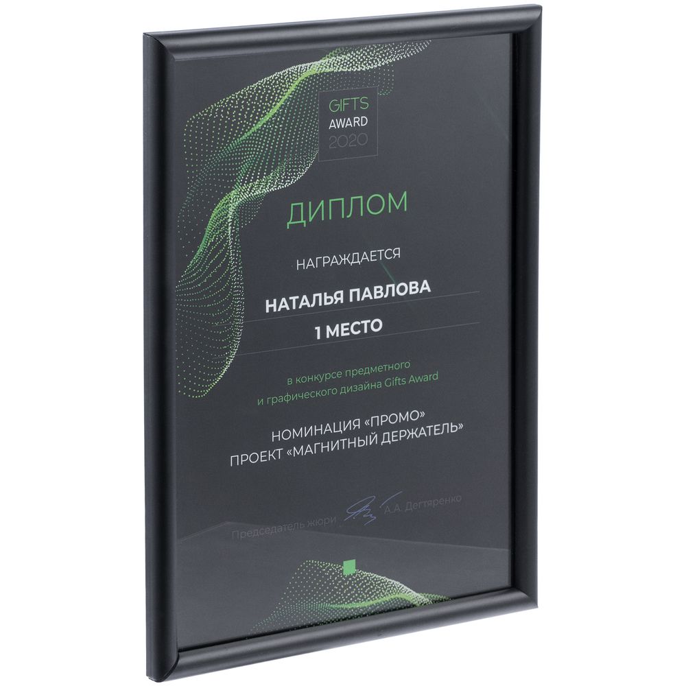 Строгая черная рамка для дипломов, сертификатов и благодарственных писем формата А4. Переместив крепление на заднике, можно повесить вертикально или горизонтально.