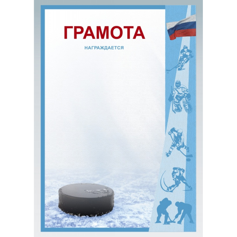 Грамота, формат А4. Бумага матовая, толщина 200 гр, полноцветная печать. ¶Фон грамоты белый. В нижнем левом углу изображена хоккейная шайба на льду. В верхней части по центру написано слово "Грамота" красным цветом, под ним написано "награждается" голубым цветом. С правой стороны грамоты расположена полоса светло-голубого цвета, расширяющаяся сверху вниз, и полоса ярко-голубого цвета, расширяющаяся снизу вверх. На светло-голубой полосе ярко-голубым цветом изображены силуэты хоккеистов в количестве 5 штук, в верхнем правом углу изображен российский флаг, извивающийся на ветру. Грамота имеет окантовку ярко-голубого и серого цветов.¶