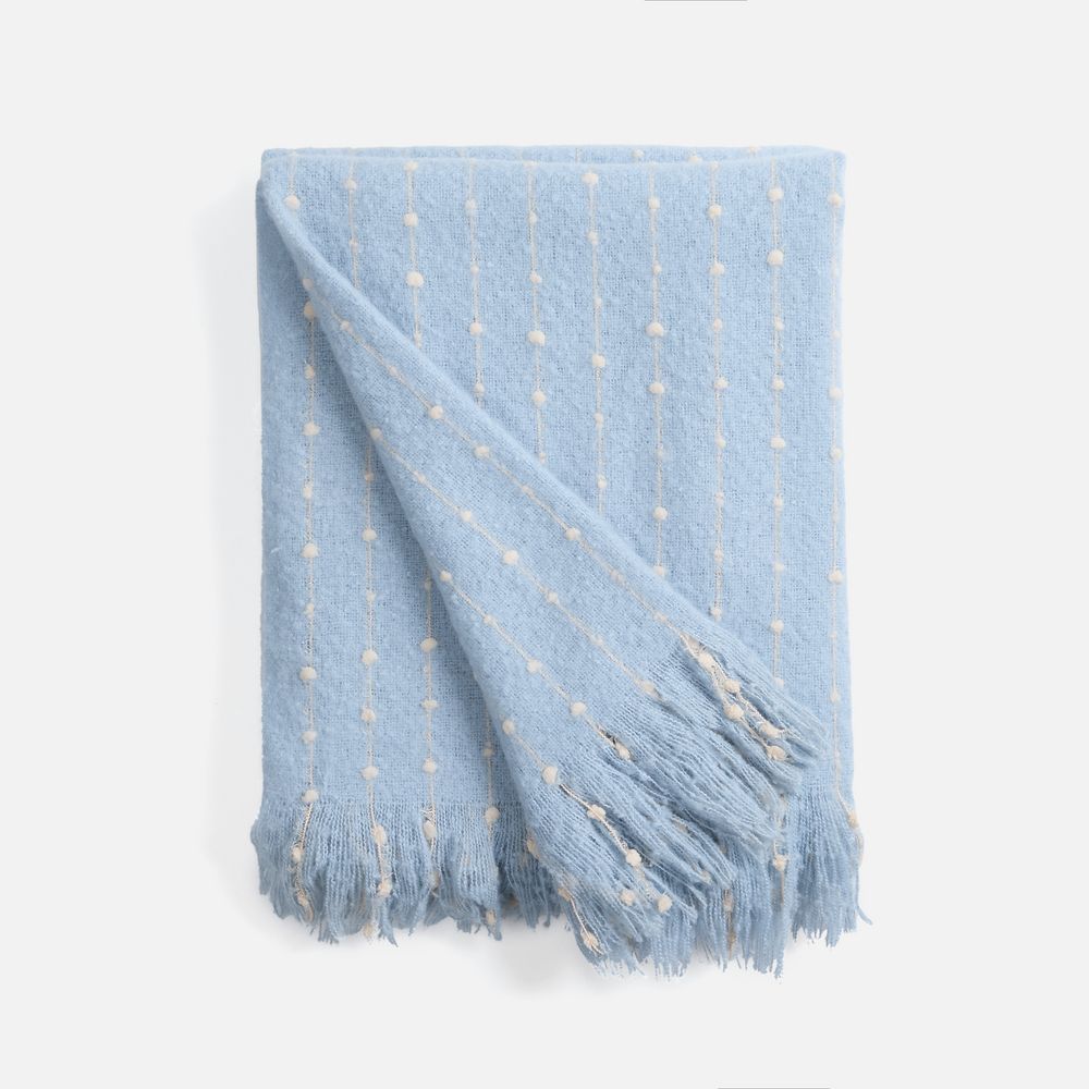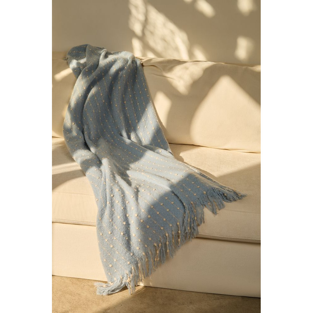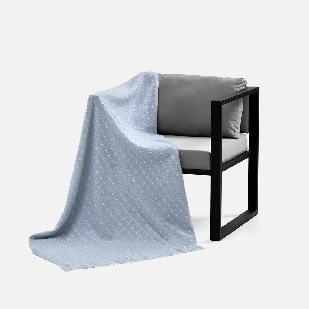 Изысканный плед небесно-голубого оттенка покоряет своим дизайном с первого взгляда. Особая текстура выпуклого узора в точку делает изделие не только визуально привлекательным, но и невероятно приятным на ощупь. Изящный пунктир, плавно переходящий на декоративную бахрому, придает пледу неповторимый шарм и элегантность.