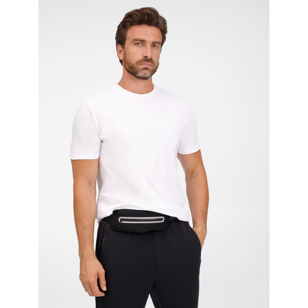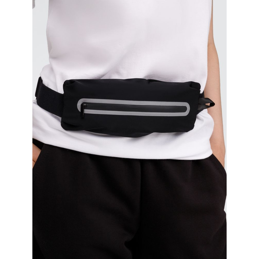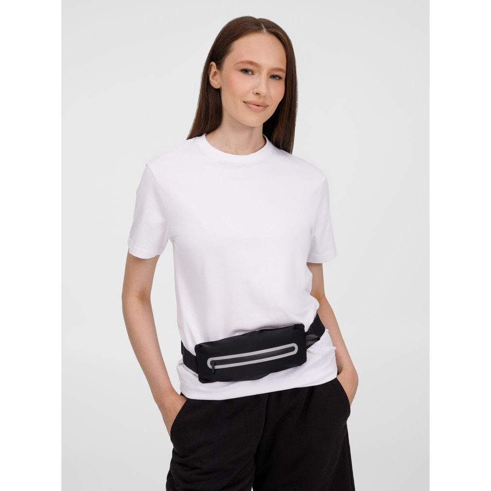 Регулируемый ремень из широкой эластичной резинки с плоским фастексом плотно облегает тело и удерживает сумку во время тренировок. Водоотталкивающая пропитка ткани защитит от влаги и грязи, а светоотражающие детали помогут оставаться заметными во время тренировок в сумерках и темноте.