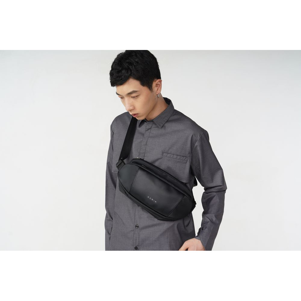 Модная эргономичная наплечная сумка FlipSling cделана из инновационного водоотталкивающего материала, устойчивого к порезам, трению и другим механическим воздействиям, в комбинации с искусственной кожей.
