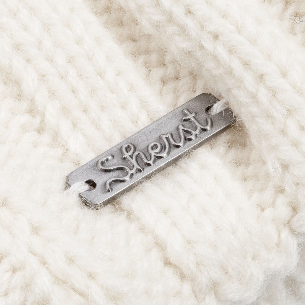 Металлический шильд с названием бренда расположен у заднего шва шапки. Это оставляет место спереди для пришива лейбла или шильдика с логотипом заказчика.