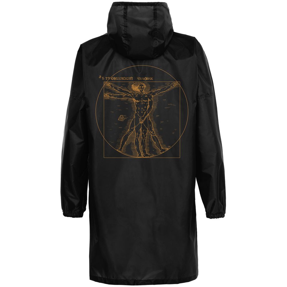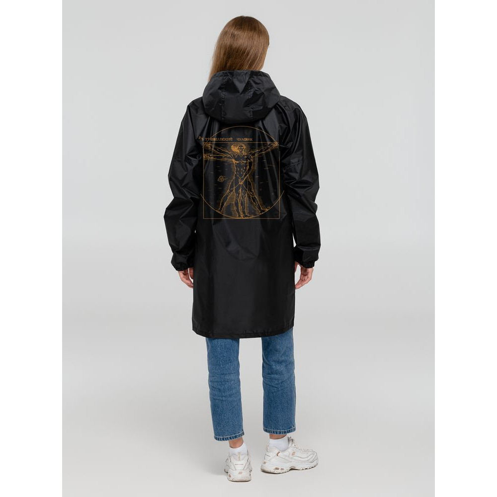 Ветреная погода может внести свои коррективы даже в идеальную симметрию! Сильный порыв — и человек с картины Леонардо да Винчи стал ВЕТРОвианским. Главное — успеть удержать фиговый листочек на нужном месте.Плащ-дождевик из ткани таффета на молнии с капюшоном. Складывается в мешочек — удобно брать с собой.