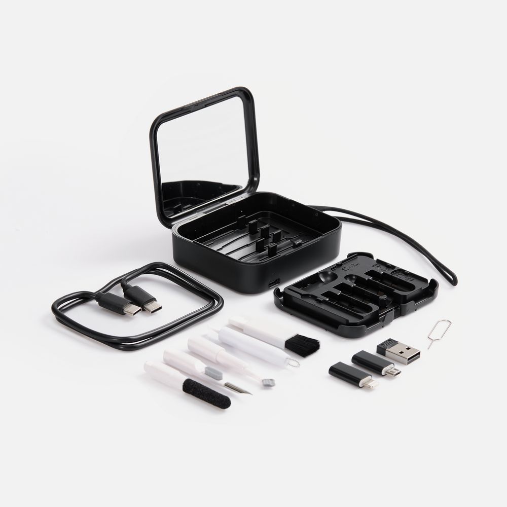 - аксессуары для чистки гаджетов: щетка с наклонной щетиной, перо для чистки со щеткой для наушников, насадка для чистки футляра от наушников, двусторонняя насадка для чистки разъемов зарядки, щетка с мягкой щетиной