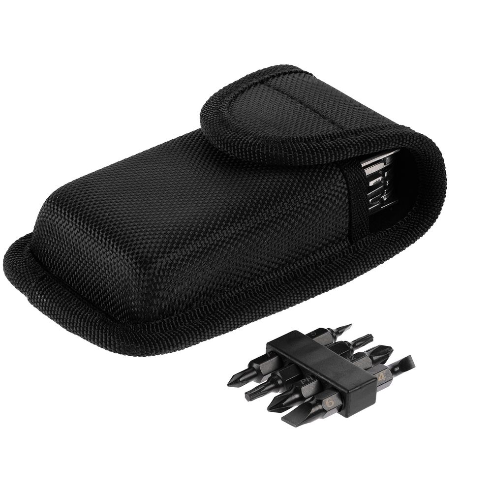 В комплекте мультитул, чехол и набор из 4 двусторонних съемных бит.