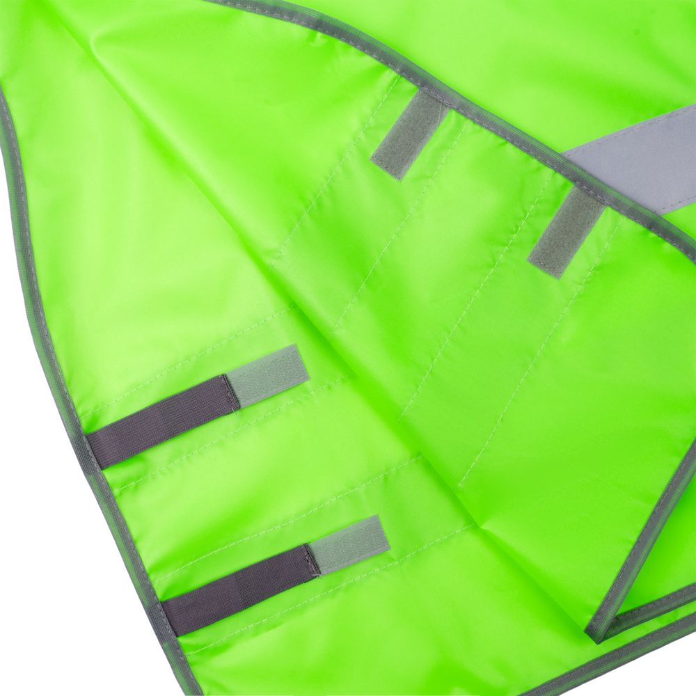 Детский светоотражающий жилет с застежкой-липучкой с одной стороны. Надевается через голову.
