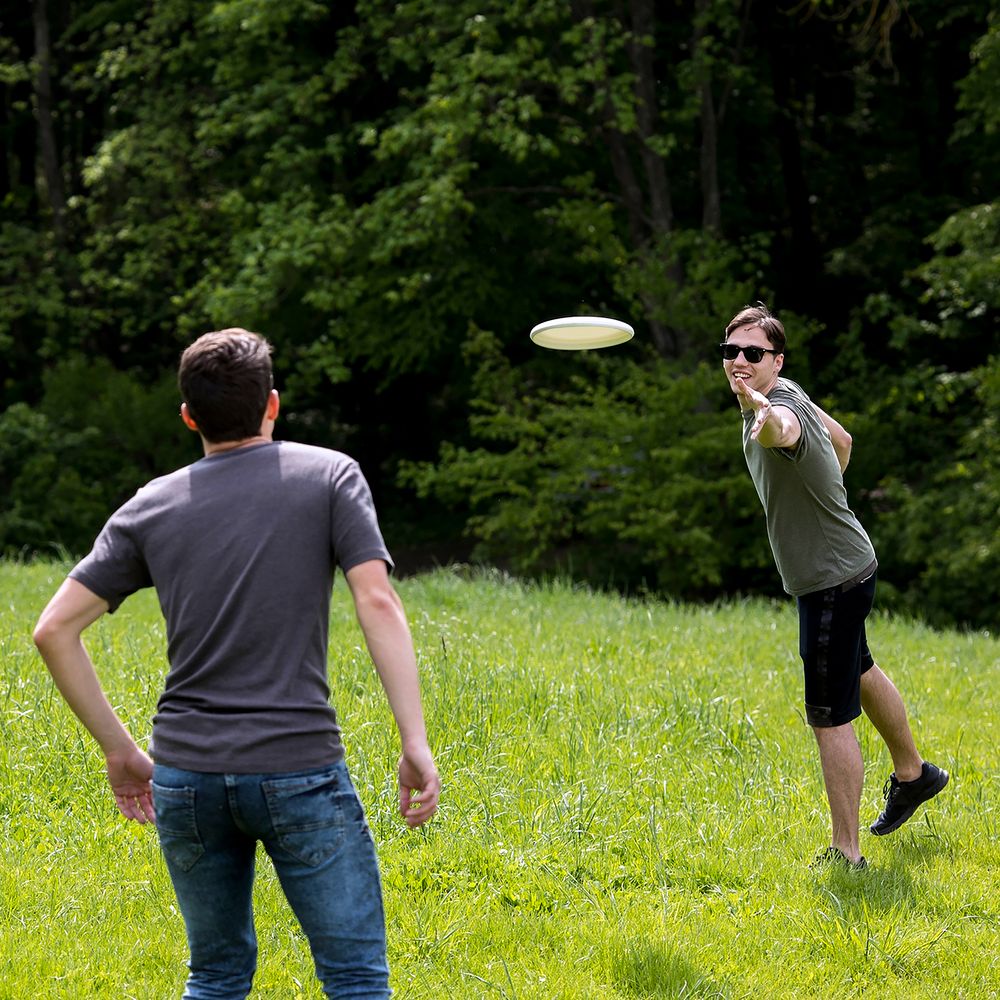 Во фрисби можно играть на свежем воздухе с детьми, друзьями и домашними животными.